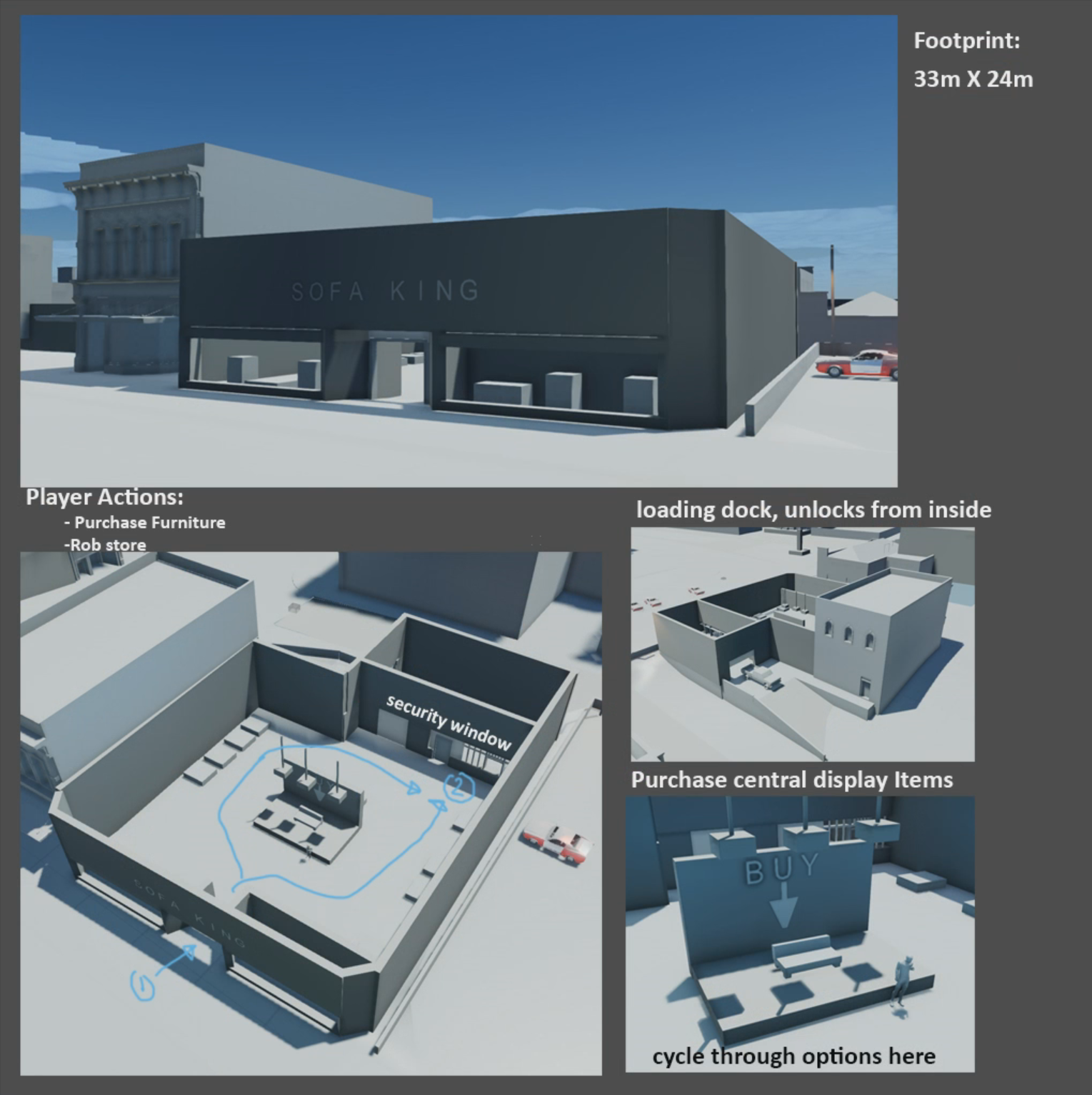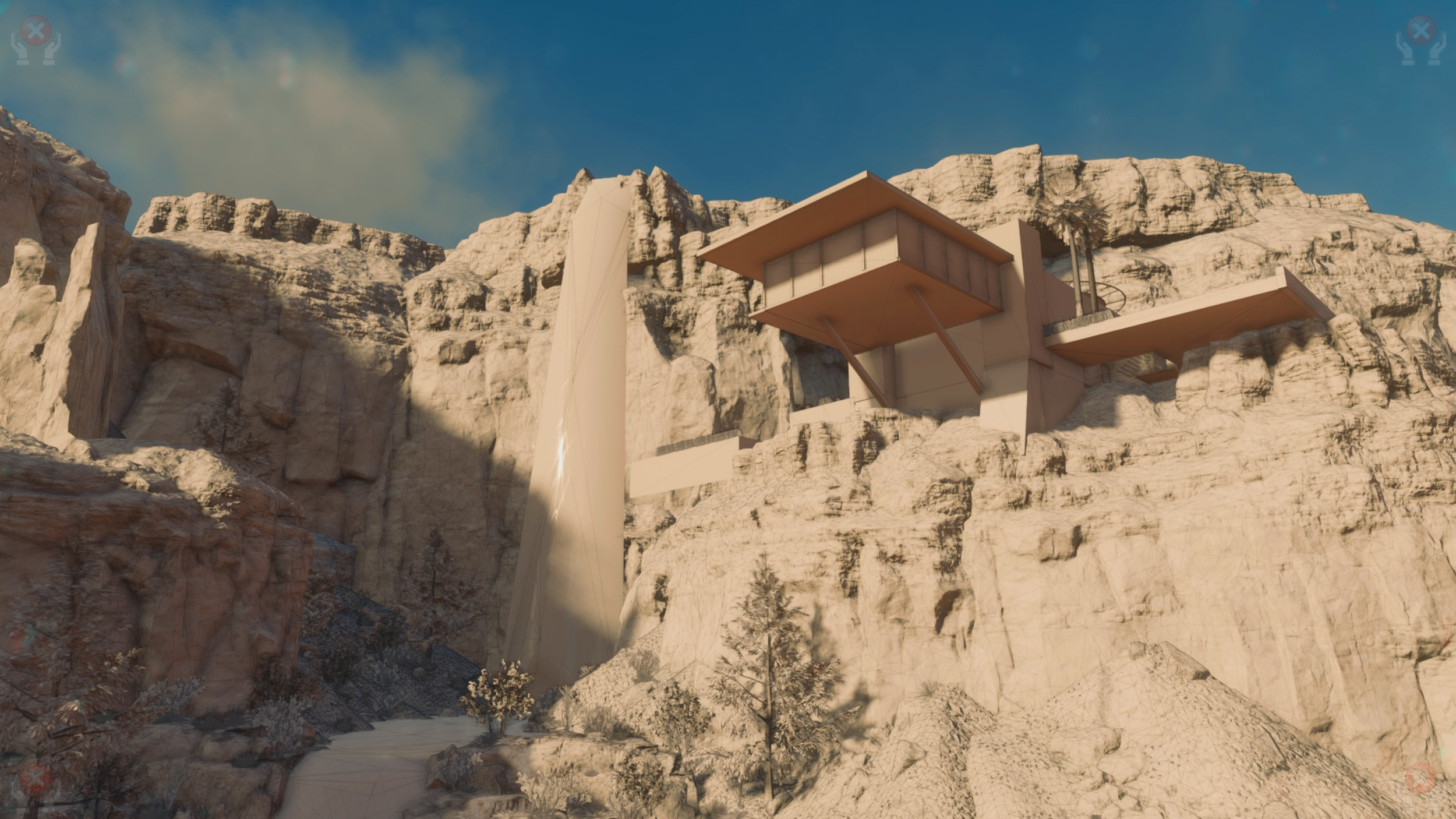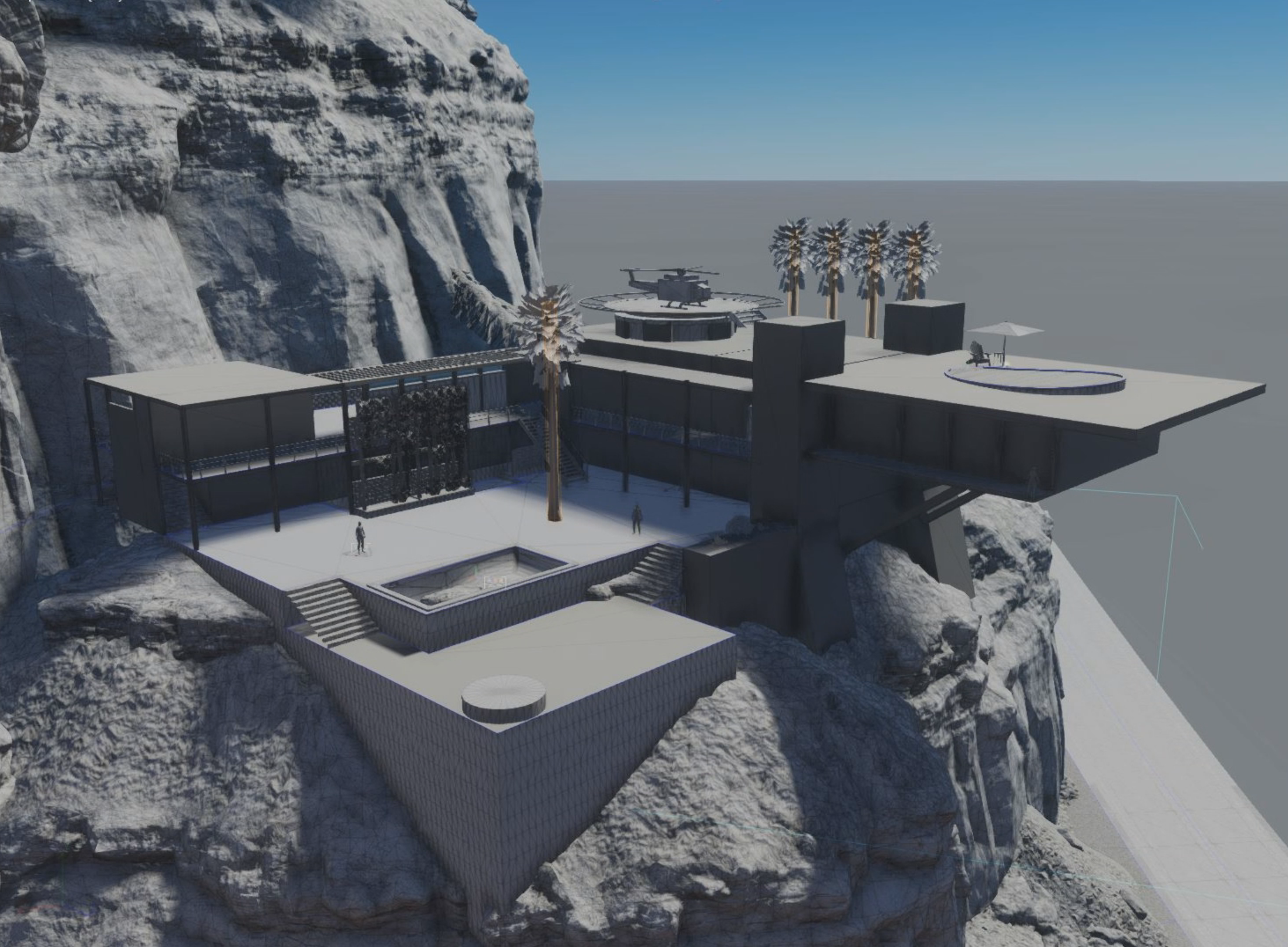 As gameplay and location became more concreate designers could quickly jump down to a block prototype location or build specific encounter spaces. This is one of the first combat space built and a testing ground for interactive environment props.