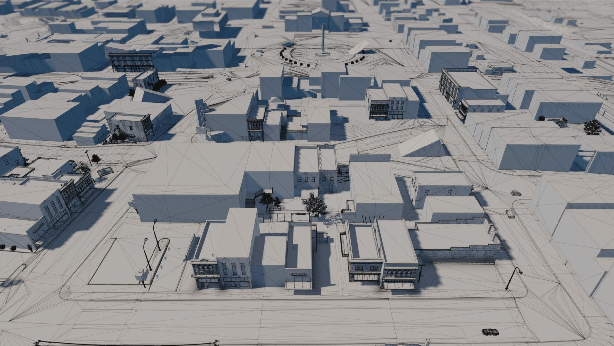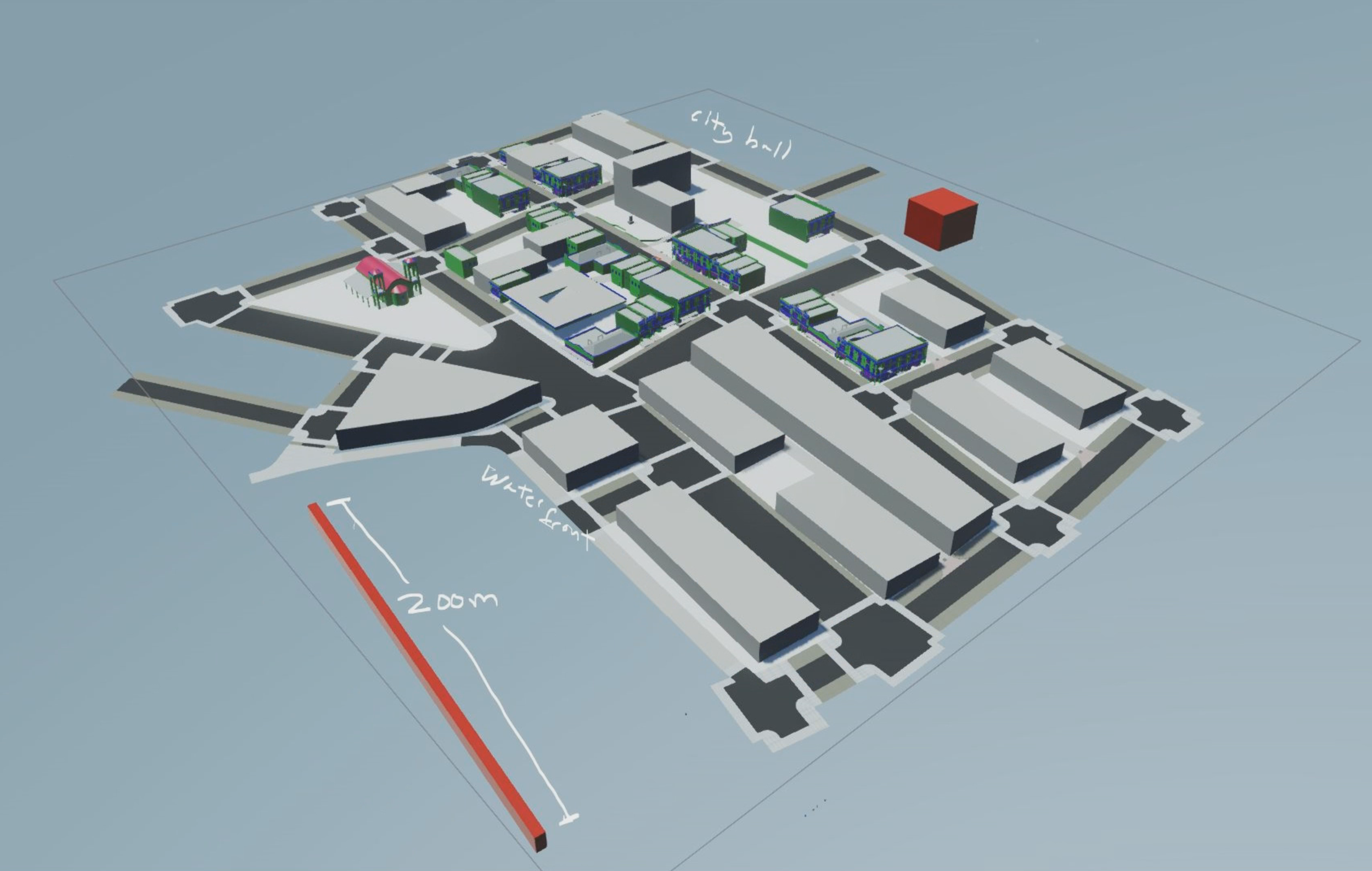 Next step is solving terrain and elevation. How does this district fit with the natural landscape? How might the people who live there build with the terrain and what kind of gradient can our tools support? I knew that I wanted split the district over a hill with the civic buildings being at the highest point. Blockout always feel better when building with terrain, rather than grid. This is very first scale test area.