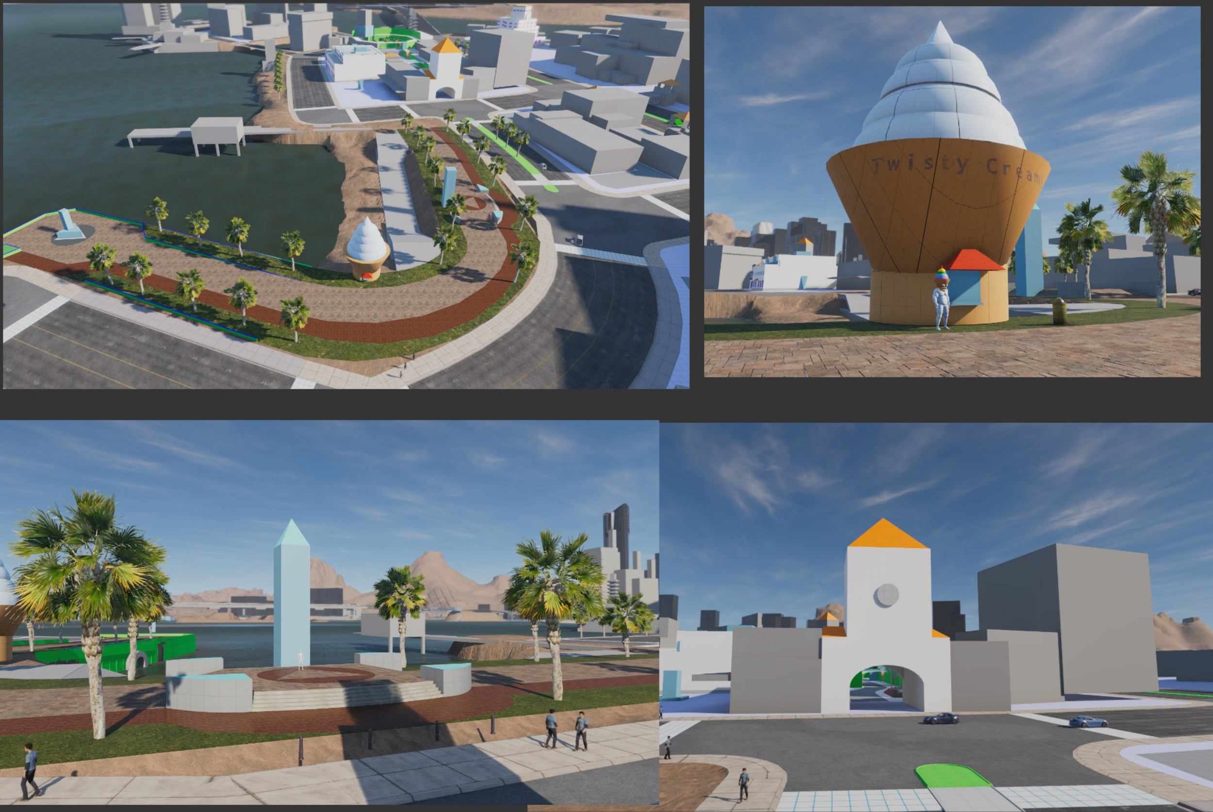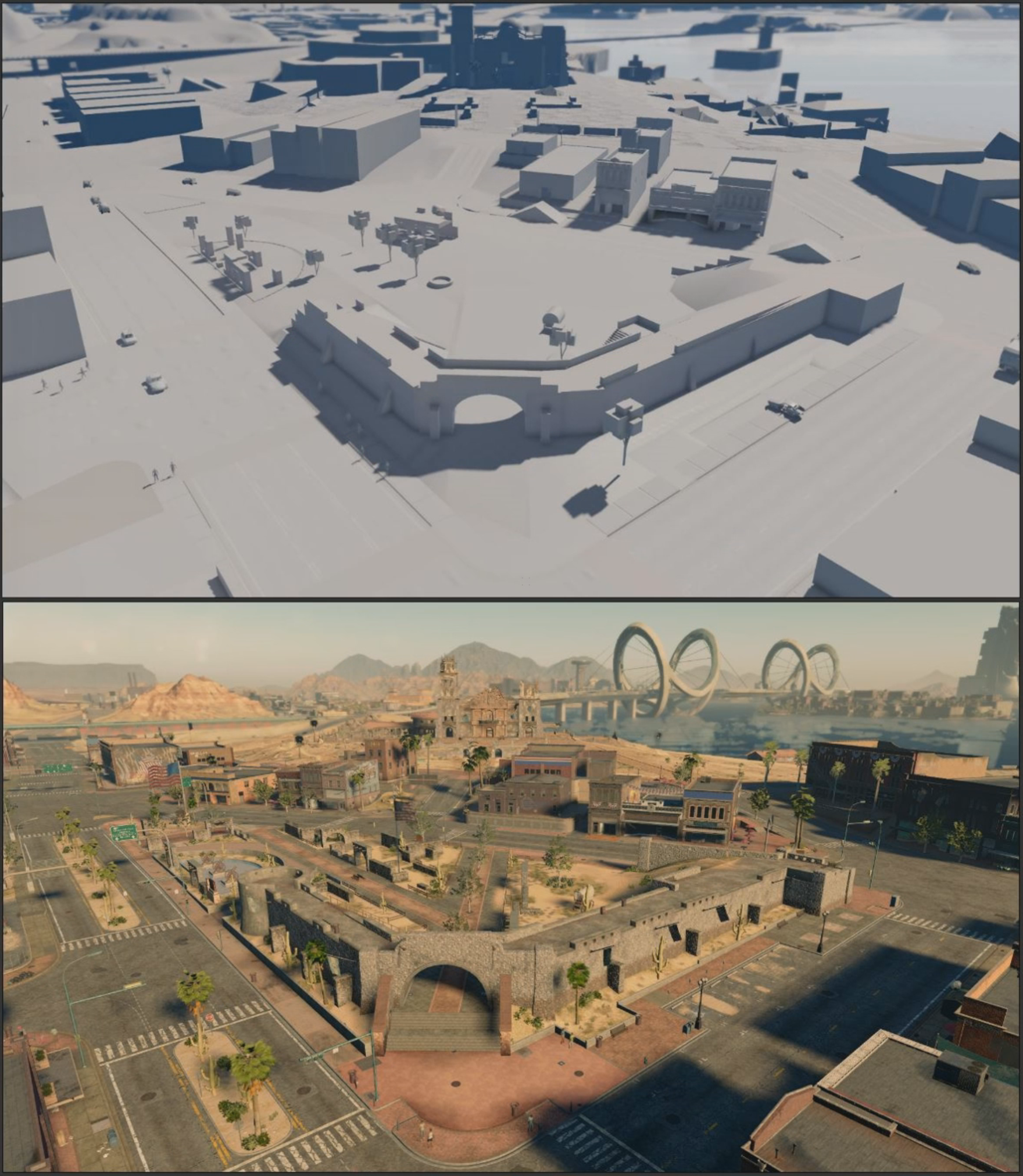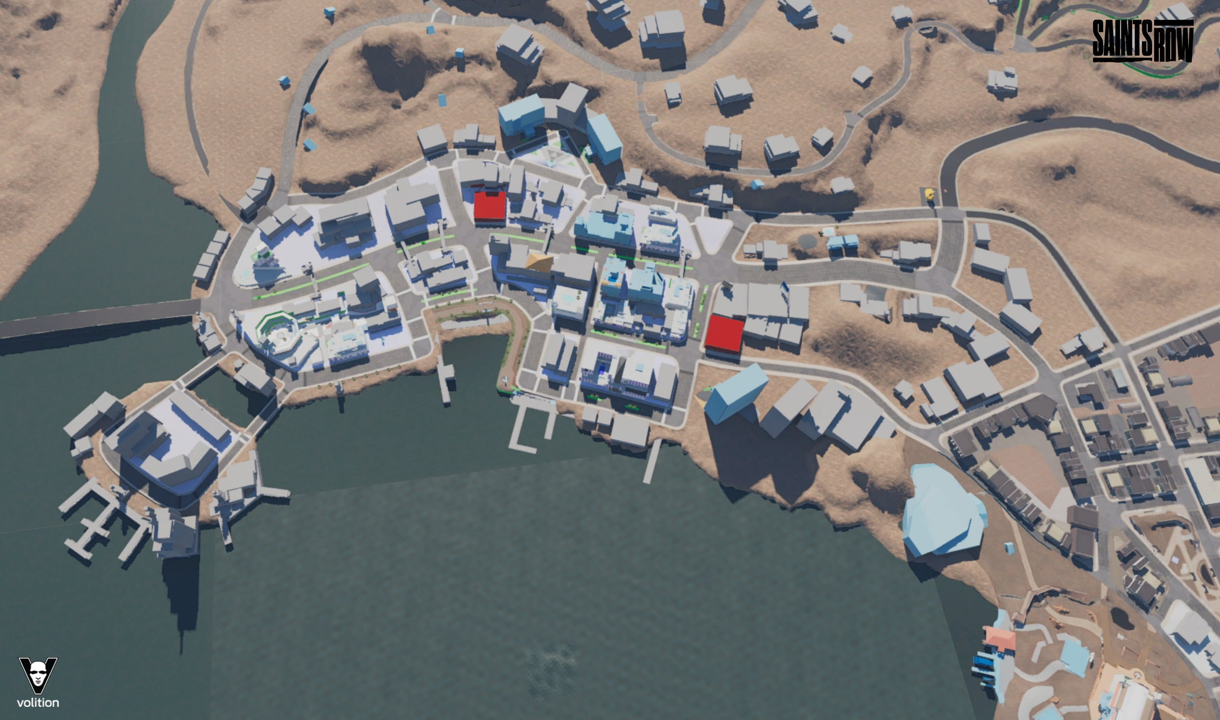 Here are a few examples of blockouts that I made for the Old Town and Marina Del Lago districts of the city taken from scratch all the way to to final. I was the main Level Designer for these districts overall, which means I laid out the entire road network and painted in major elevation features. I built the first pass blockouts for the city blocks and designed any gameplay-significant spaces/structures as needed. Green structures are prefab kit buildings created by Artists; anything else was built by me.