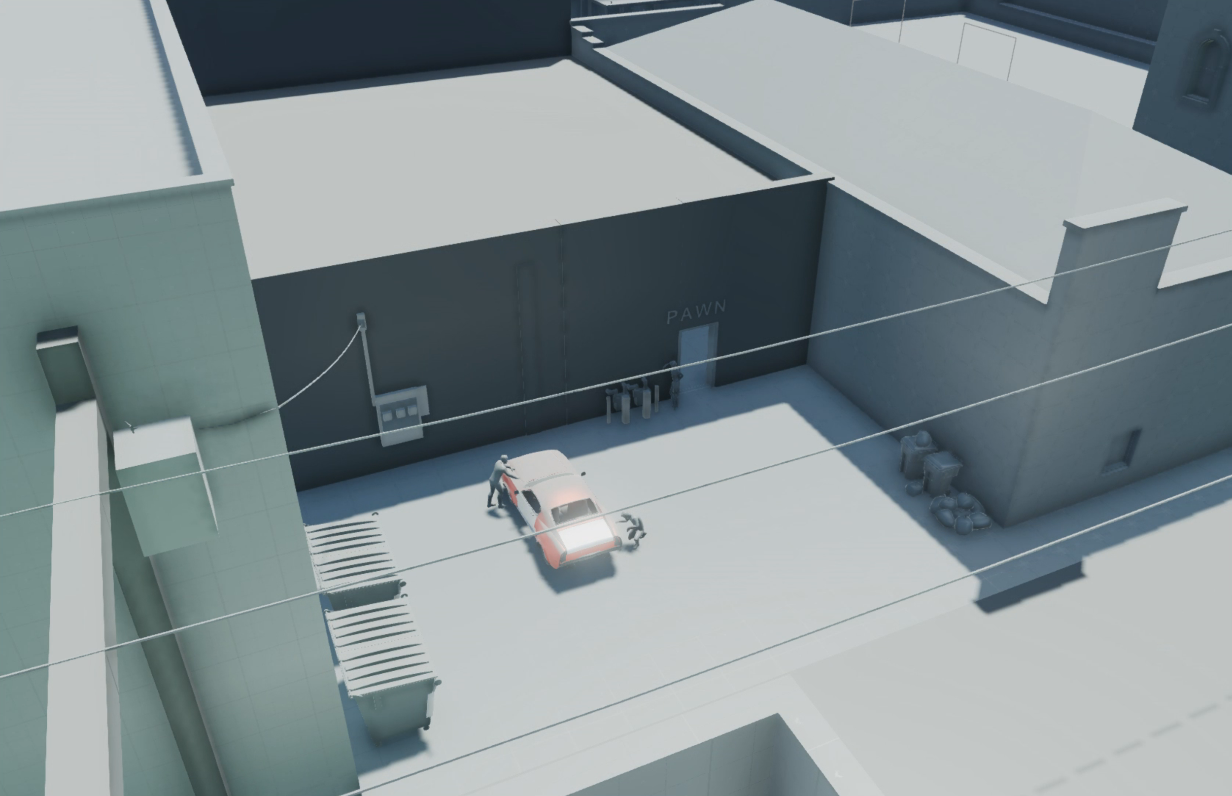 Through the process Art and Design work together to develop each district. One of the other roles for Level designer was maintain the infrastructure of the city: Traffic & GPS data, intersection timing, pedestrian sidewalk splines, parking, ambient life placement, population composition and density, day/night life and Navmesh.