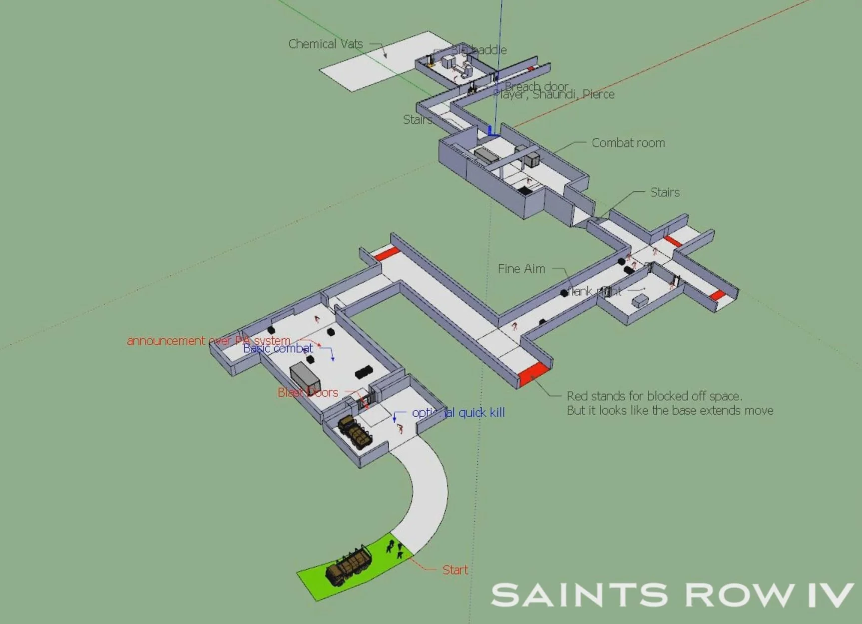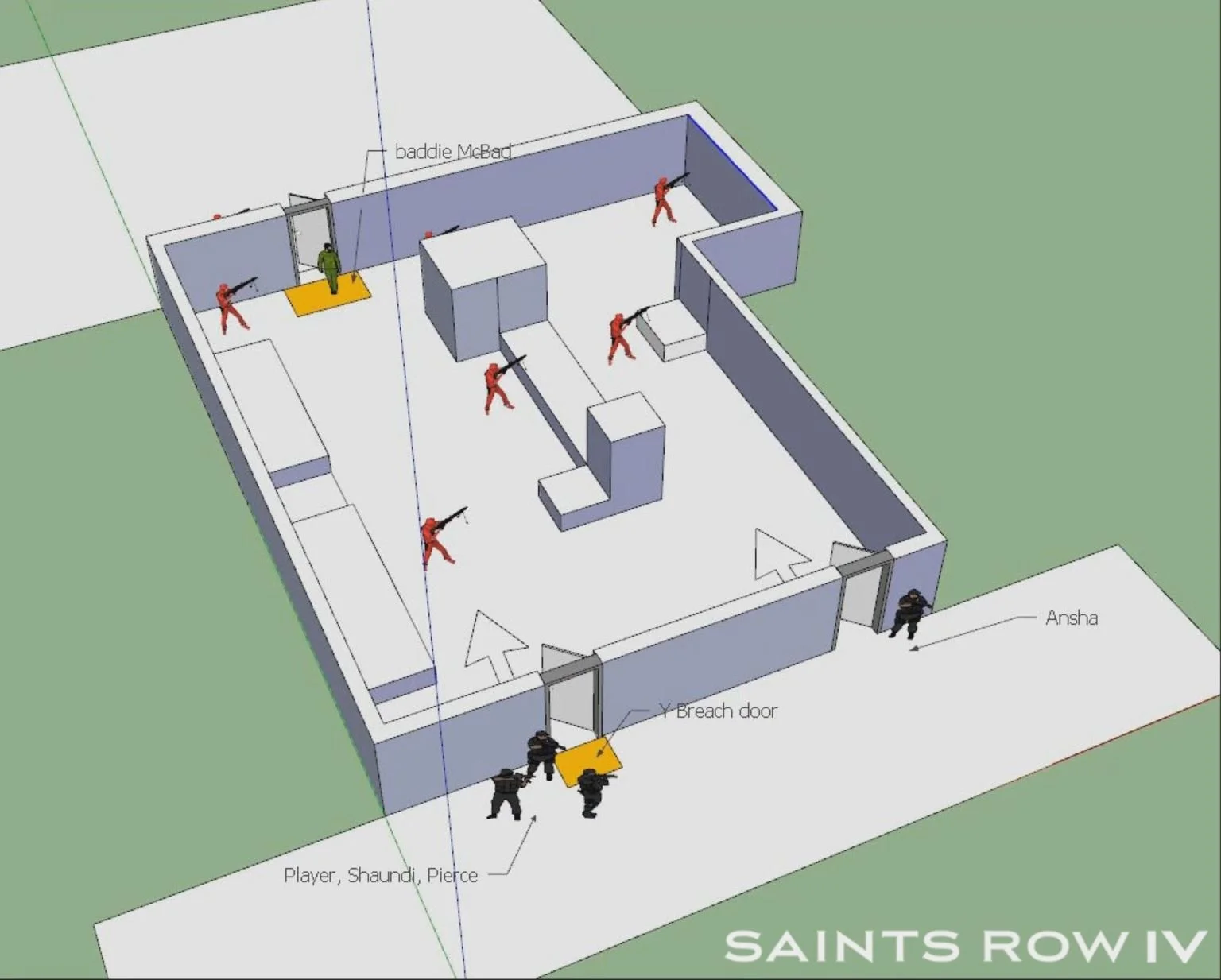 Mission Zero Saints Thirty: The setup for the slow-mo Room Breach sequence. Both co-op players were required to be in position to start. And I wanted to make sure each player got a clear view of the escaping villain and had equal to chance to clear the room