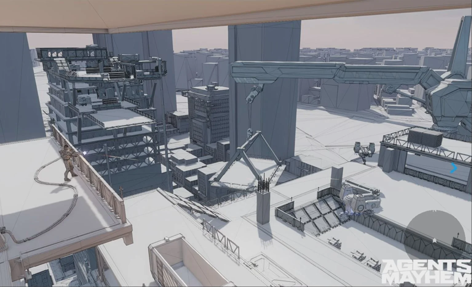 Most city blocks in Seoul were built as a cluster of layered combat arenas linked by various traversal mechanics - anything from very simple traversals to more elaborate platform jumping sequences with aerial drones, etc. At a high level, the procedural gameplay manager system would select a type of content and look for blocks or encounter volumes of a certain size that contained all the necessary pre-placed markup that it needed to work. Level Designers constructed spaces with kit pieces, building prefabs and custom geo as needed. LD were also responsible for placing markup needed for gameplay and placing ambient life nodes.